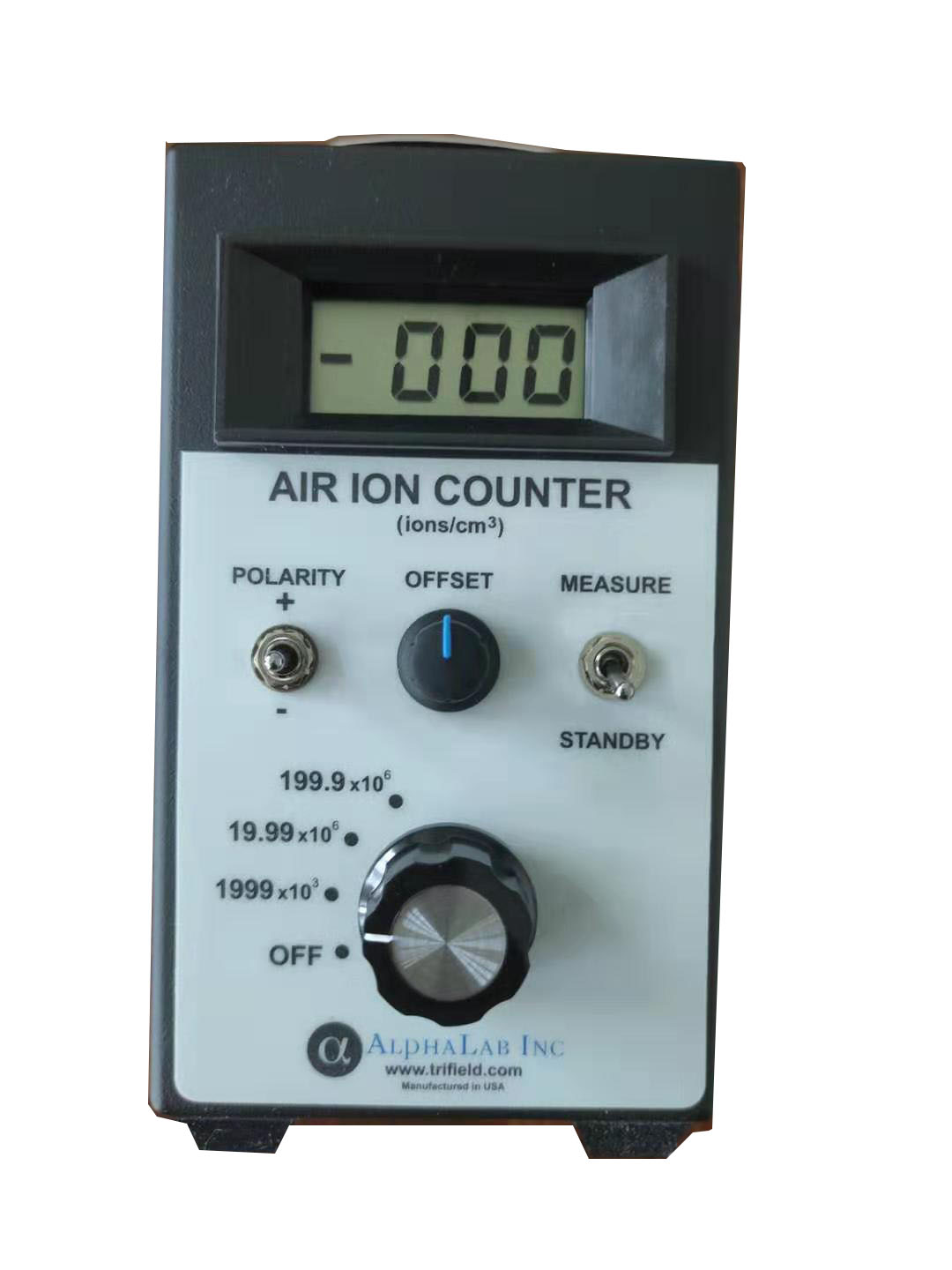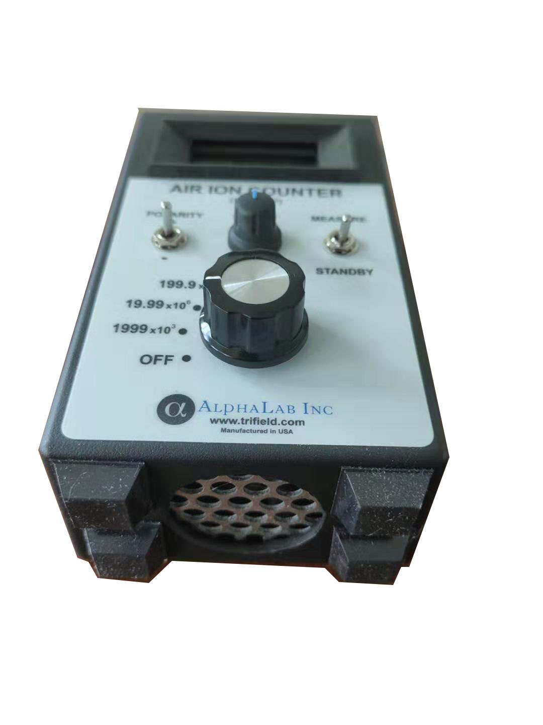 6、测量时,右侧搬到MEASUREKAISHI 开始测量。让带铝片挡板短进气或者对着被测量的产品,空气负离子浓度仪是吸引空气(或者带有离子存在的气体)通过带电的平行极化电极板进行计数空气中的正、负离子(气体)浓度的,外侧二板保持极化(正、负)电势。中间是线性检测器板。空气的孔隙是4MM,极化区的电势是1000V/M。既可测定正离子,又可测定负离子.也可测定有关机体的负离子浓度,如环境、固体物质(石头和灰)、布匹、纤维等。