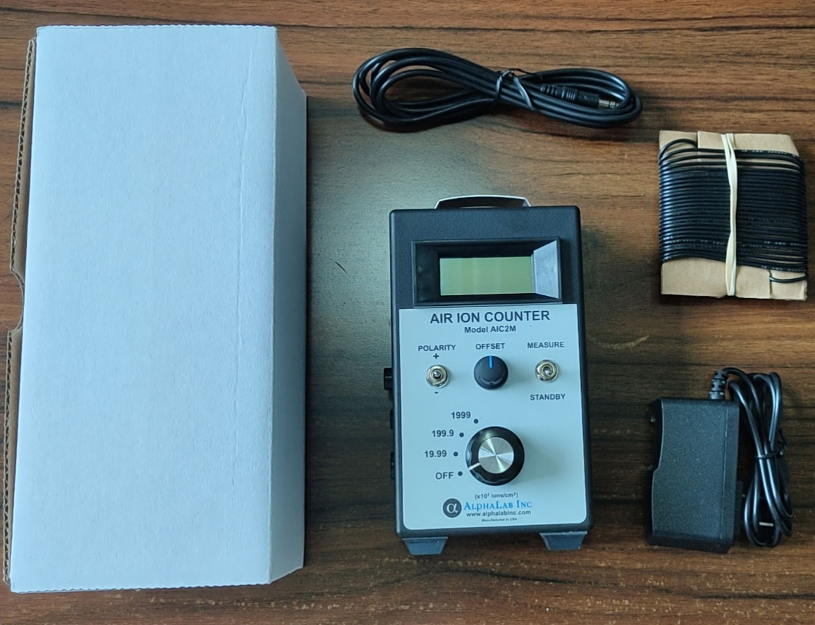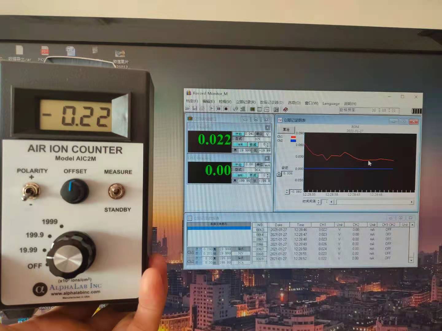6、测量时,右侧搬到MEASUREKAISHI 开始测量。让带铝片挡板短进气或者对着被测量的产品,空气负离子浓度仪是吸引空气(或者带有离子存在的气体)通过带电的平行极化电极板进行计数空气中的正、负离子(气体)浓度的,外侧二板保持极化(正、负)电势。中间是线性检测器板。空气的孔隙是4MM,极化区的电势是1000V/M。既可测定正离子,又可测定负离子.也可测定有关机体的负离子浓度,如环境、固体物质(石头和灰)、布匹、纤维等。